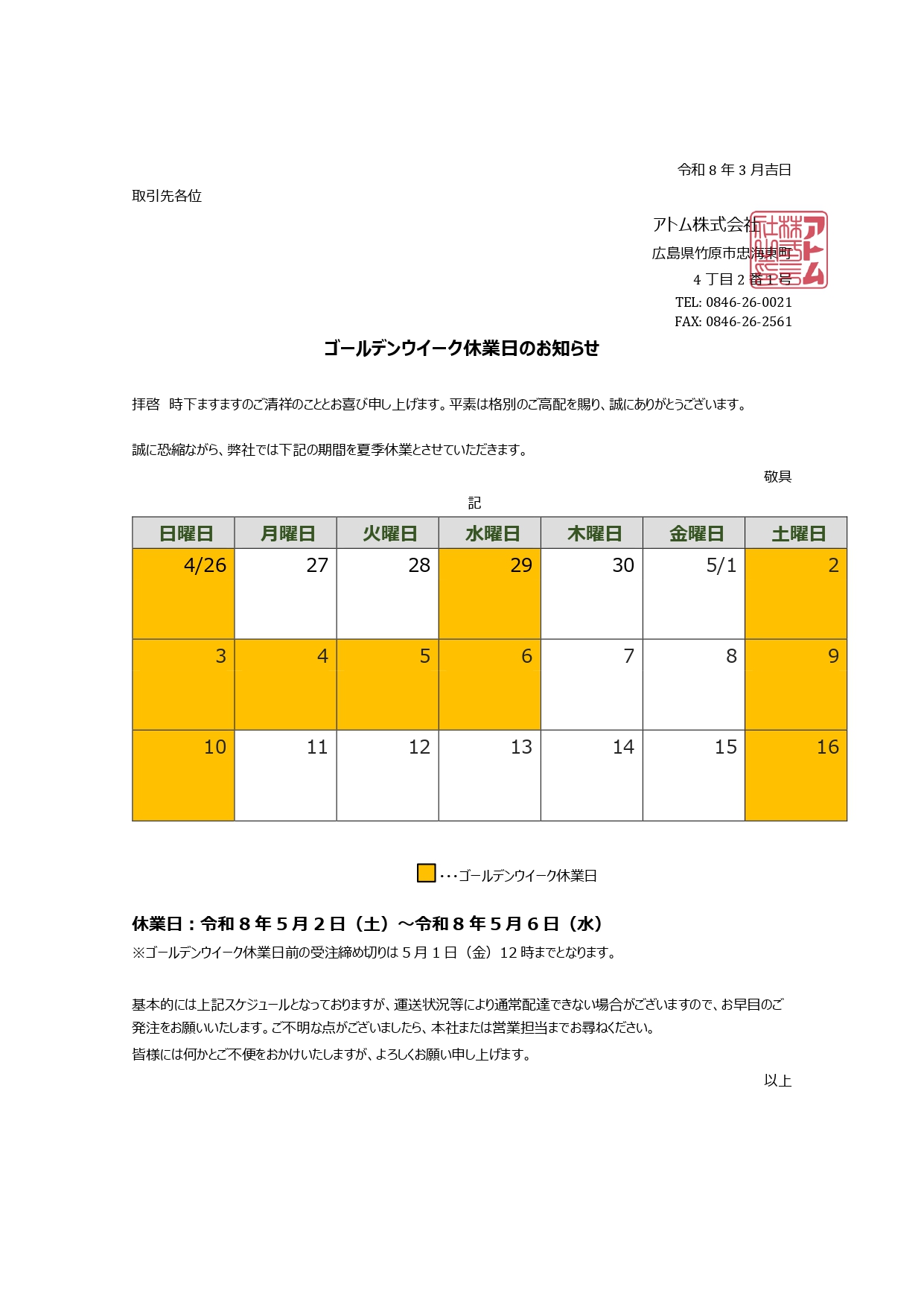 さて、ゴールデンウイークにつきまして、誠に勝手ながら上記のとおり